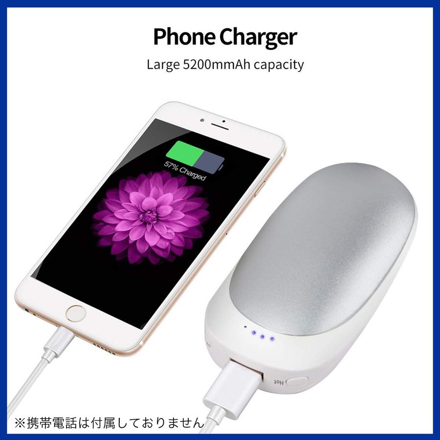 5200mAh 大容量でスマートフォンの予備バッテリーとしても使えちゃいます!! バッグやポケットに忍ばせて、寒いときにカチッとスイッチON! 通勤通学、お買い物、お出かけ、寒いオフィス内、アウトドアスポーツのお供に最適の充電式カイロです。